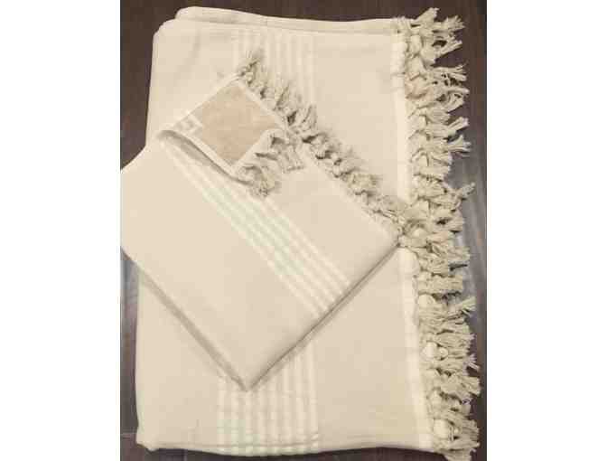Turkish towels anyone? Hand-loomed in Turkey with 100% cotton, Smyrna Collection's Turkish towels are quick drying, extremely absorbent, light, and classy. Bath set includes one terry-lined tan body towel with coordinating hand towel. Can be used as a beach towel, bath towel, scarf, table cloth, sarong, light throw, bath sheet, and much more.