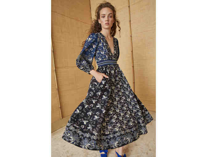Iona Dress from Ulla Johnson -- Ulla Johnson's Iona dress is crafted in a patchwork of plain-weave cotton batik-printed with indigo, ivory, and navy floral patterns. This style is detailed with hand-embroidery at the seams and waistband. Women's size 6.