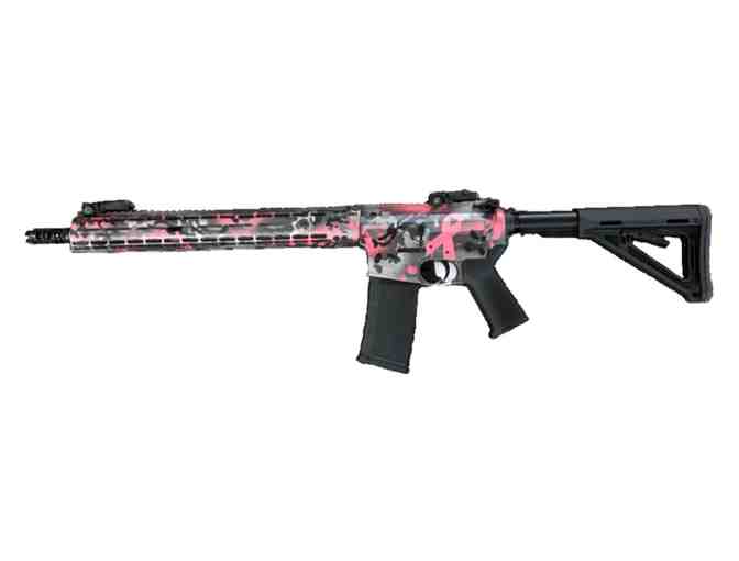 Custom built for the Red Tie Gala by Commissioner Kolb, this AR15 is a special edition honoring breast cancer awareness. Coated with a pink and grey blend in Battlework Cerakote, this AR includes a Magpul grip and stock.