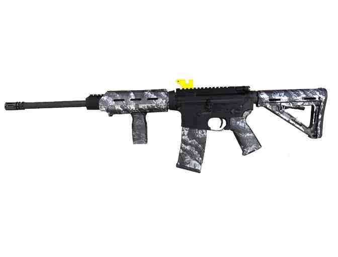 Made in America, this DPMS Panther Arms AR15 .223 includes a black and white skull designed matrix rifle kit.