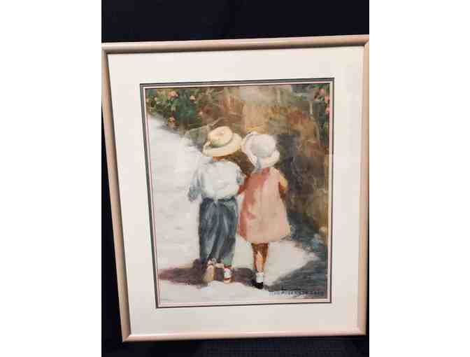 Children in the Garden print in light pink metal frame measuring 23 1/2 x 27 1/2.