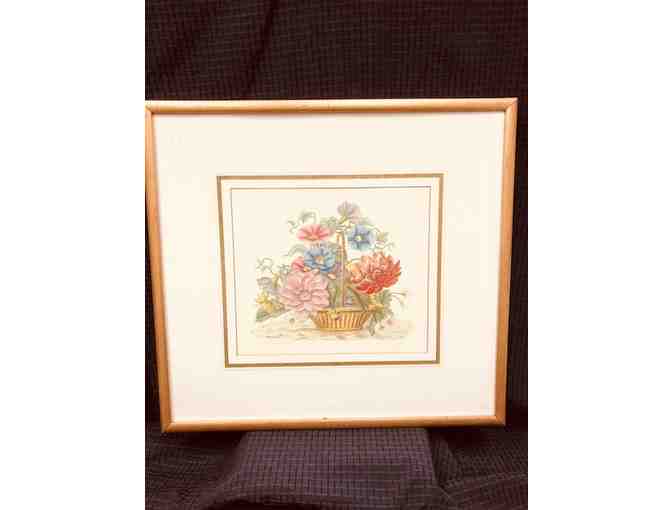 This print is so beautiful in real life. Dahlia and Morning Glory flowers are colored brightly and held in a basket in the print.