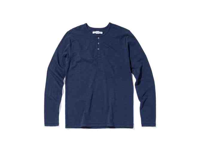 Designed to both look good and be environmentally conscious, the Canyon Henley by Outerknown features a long sleeve classic fit in a mid-weight 100% organic cotton slub jersey. Mother-of-pearl buttons and self-binding detail on pocket. Stitch detail around sleeve and bottom hem. Colors include white and navy. Size Large.