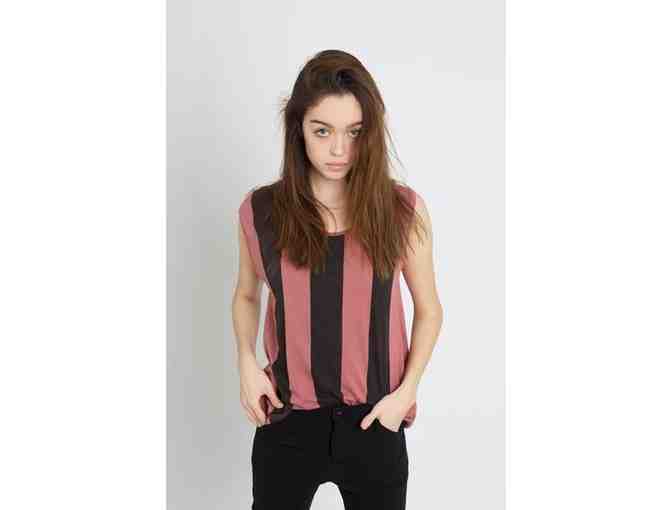 Simply chic Hayden Punk tee by June 7.2 in red and black. Stonewashed muscle tee, with broad red verticle stripes on front and back. Size XS.