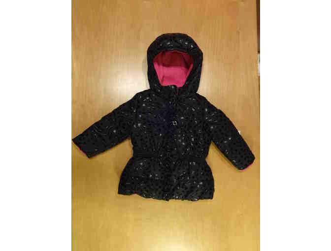 Warm winter jacket for your little love. Black on black hearts with bright pink soft fleece inside. Full zip, with a heart charm for a pull. Cute bow and ruffle detailing, gathered waist. Soft fleece cuffs keep little wrists warm.