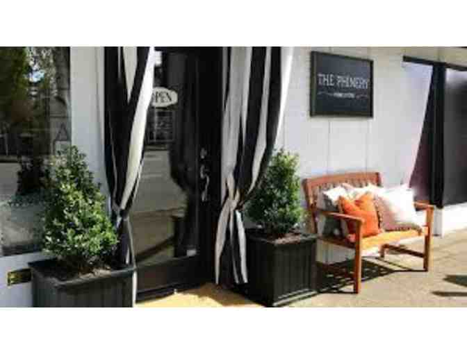 Gift Certificate for a 1 hour interior design consultation or paint color consultation at your home. A suite of home accessories including an impressive hurricane candle lantern, a braza planter with flowering plant, and a molten brass frame with original artwork.