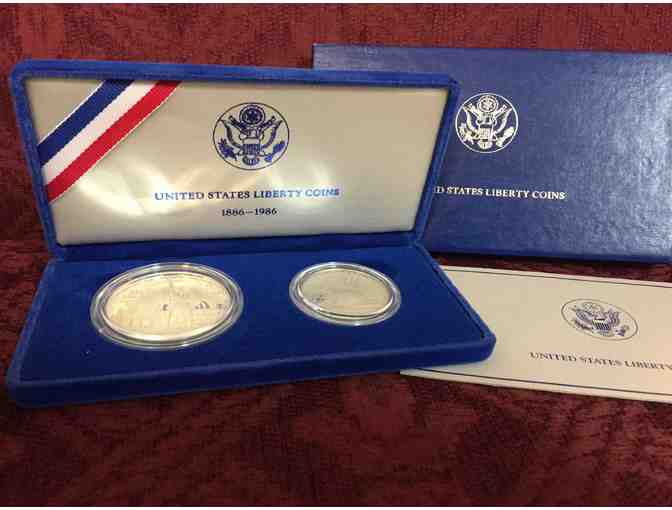 A U.S. Liberty Coins 1986 Silver Dollar and Half Dollar Commemorative Set.