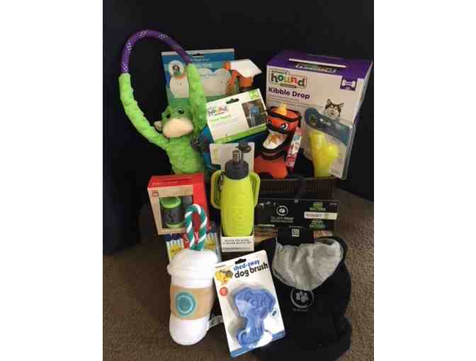 Pamper your pooch with this assortment of doggie gifts! Included is a hoodie, travel dog bowl and water dispenser, doggie towel, treat pouch, sonic stick, kibble dispenser toy, odor remover spray, bag dispenser and 3 more toys.
