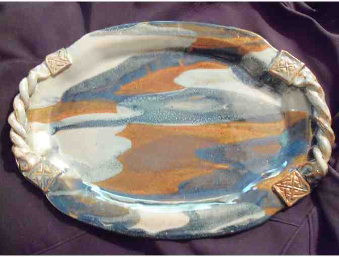 Beautiful and functional handcrafted platter created by Pamela Reid, resident artist at the Sandy Spring Museum and pottery instructor through the Montgomery County Recreation Dept. Platter measures 12x15 inches in multicolor glazes of blues, greens and browns and is microwave, oven and dishwasher safe.