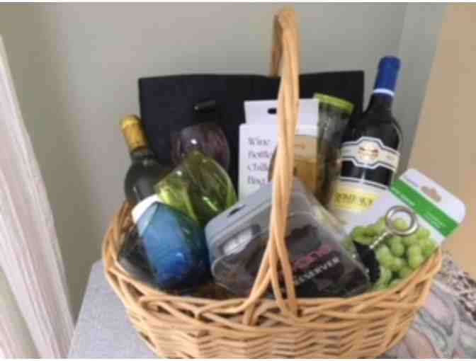 2 bottles of wine with carrier, wine bottle chill bag, opener, four colored glasses, preserver set, and aerator. Enjoy!