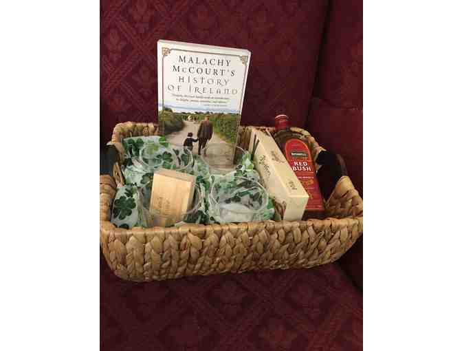 Enjoy St. Patrick's Day any day with a bottle of Bushmills Red Bush Irish Whiskey, a set of four whiskey glasses, whiskey ice stones, Irish whiskey truffles, and a "History of Ireland" book!