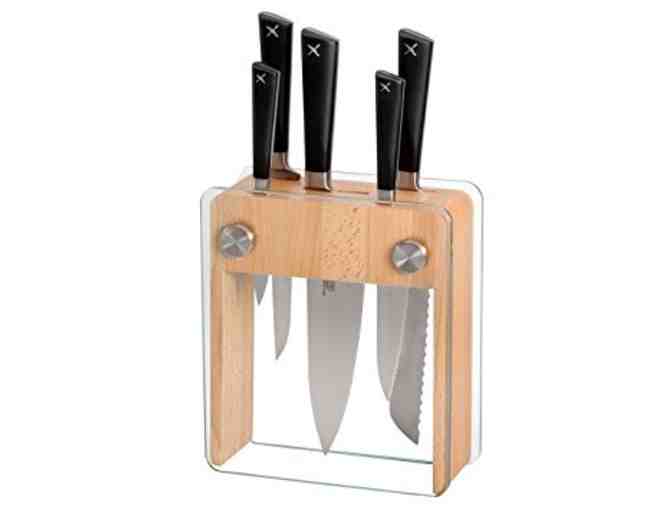 Spruce up your kitchen decor! Get this beautifully crafted knife block with 6 fully forged knives! Glass see-through windows makes it easy to find the right knife. Full-tang, triple-riveted Delrin handles offer exceptional grip, won't break down when exposed to oil, and withstands all temperatures.