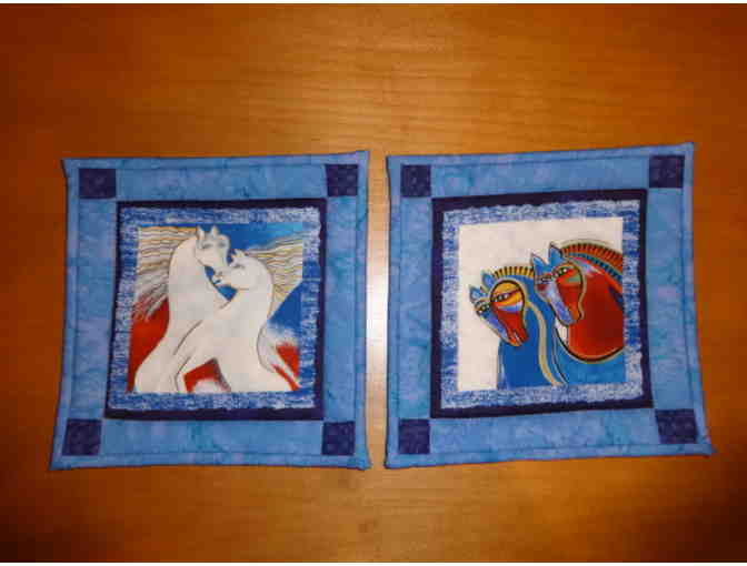 Two vivid and vibrantly colored images of mythical horses are paired with watercolor patterns in these handmade pieces. Quilted of quality cotton with heat resistant material securely sewn inside. Handmade with precise corners by the math teacher from Lindbergh High, Nancy Greiner.