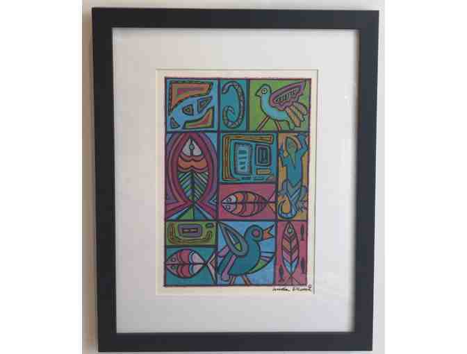 Linda Elksnin's inspiration comes from textiles, outsider artists, and mainstream artists such as Mark Rothko, Romare Bearden, and Marc Chagall. She enjoys incorporating symbols, shapes, and subject matter from a variety of cultures, including those of the American South, Appalachia, and Haiti, as well as the aboriginal people of Panama and Australia. Linda uses a variety of media (acrylic, watercolor, gouache, color pencil, pastel) and works on paper, canvas, and wood. Whether abstract or loosely based on reality, the common thread of all her work is color and graphically pleasing design. Her work is often described as whimsical and happy.