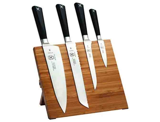 Spruce up your kitchen decor! Get this beautifully crafted magnetic board with 5 fully forged knives! This high carbon, no-stain German cutlery steel resists rust, corrosion, and discoloration. It has precision forged construction for better strength and durability and its taper-ground edge allows for added stability, easy honing, long lasting sharpness, and increased efficiency when cutting and chopping.