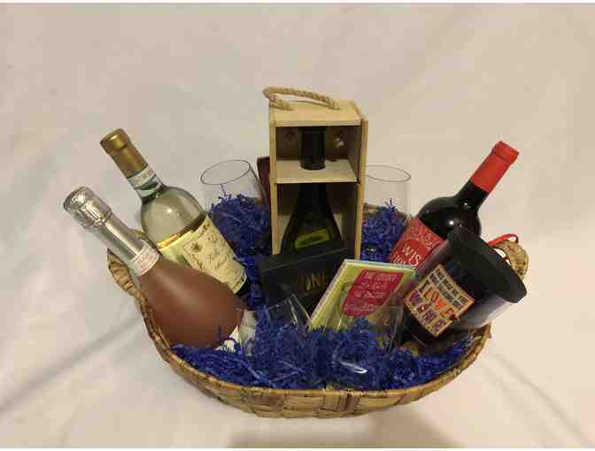 All a mom needs to keep her sanity, this basket includes 3 bottles of wine, 4 unbreakable glasses, a to go wine cup and more!!