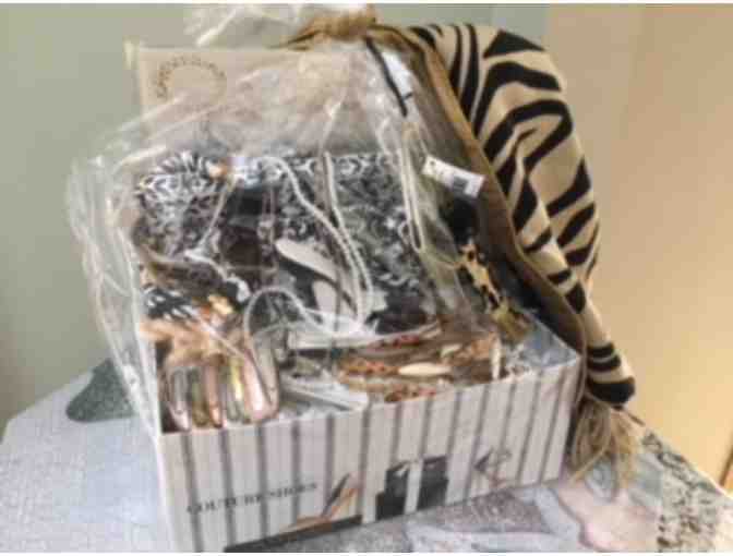 Box filled with four necklaces, passport holder, perfume, ring holder, bracelet, ornament, note pad holder, scarf, and more!