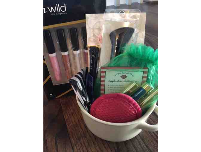 Lip Sense Package in a mug with a lot of goodies. Wet n Wild Gloss 'em up set of 4 colors. Application instructions on how to get the best lip coverage and 3 License items. Lip stick carry case and mirror, cosmetic zip bag, elf angled blush brush, and moisturizing samples. All of this greatness in a useable ceramic dish.