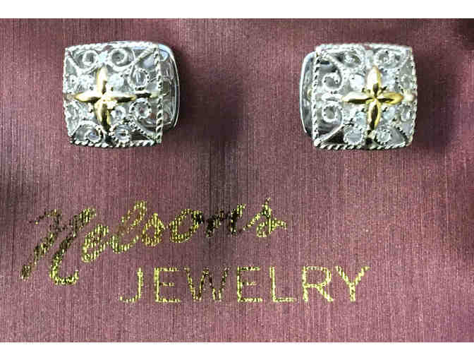 Andrea Candela: Andrea II Collection - Sterling Silver with 18KY Accent Square Filigree with 0.09tw Diamond Accent Huggie Earrings.