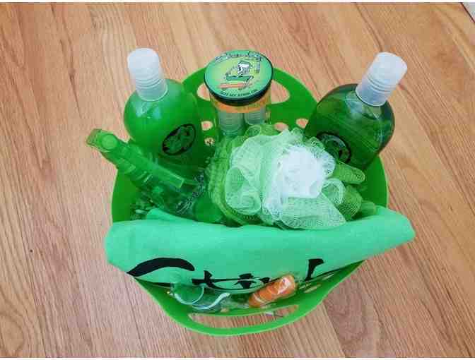Enjoy of an amazing gift basket including a Shirt, try-all pack (travel size shampoo/conditioner, body wash, 2 body sprays and scentable wristband), loofah and spray bottle.