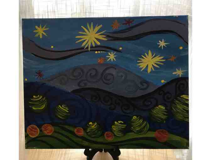 Starry night sky with rolling hills. Blues, yellows and green with orange accents.