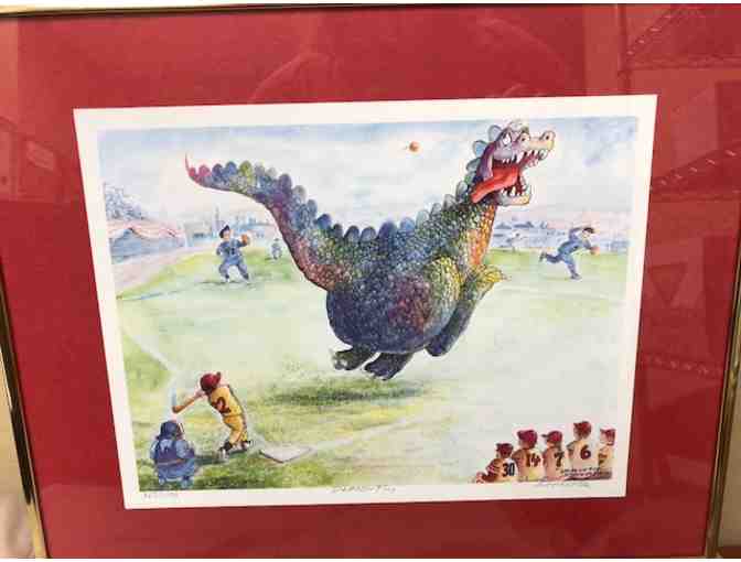 The print is matted and framed. On the back is a Verification of Authenticity. This is the perfect room decoration for a boy or girl (the series had a girl who loved sports as a main character) child who loves both dragons and baseball!