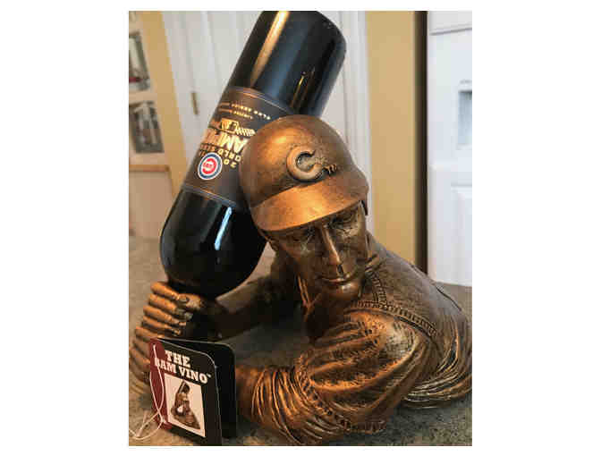 Cubs Batter Wine Bottle Holder and Bottle of Cubs Labeled Red Wine