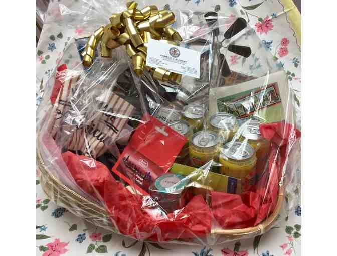 Large, Low Barbeque Basket Filled with Fabulous Feast & Treats Includes Jewel Gift Card, a Six Pack of Crystal Lake Brewing Beer, BBQ sauces, accessories and more.
