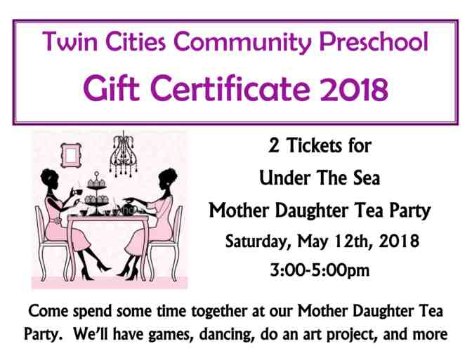 Two tickets to attend the Corte Madera Parks & Recreation Center's Mother Daughter Tea "Under the Sea" on Saturday, May 12, 2018 from 3-5pm at the Corte Madera Community Center.
