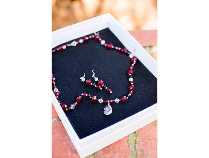 Hand-crafted glass/crystal bead necklace and earring set in USC colors by Holly LaVoie (SOM Faculty)