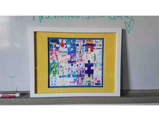 A framed puzzle with each piece painted by a student and framed with a yellow floating matte with a white frame.