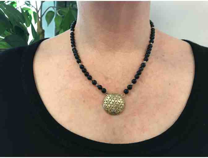 This is a black ebony beaded necklace, 18" long with a silver medallion that has a 14K plate finish. It is elegant and classic and can be worn for any occasion. This is a NYC stunning piece to enhance a sweater, a suit, or a perky shirt.