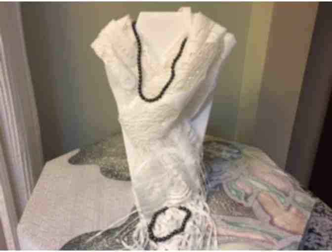 Ivory lace scarf with butterflies and flowers with freshwater black pearl 18" necklace and bracelet.