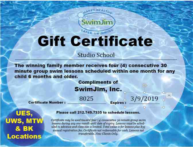 FOUR SwimJim Swim Lessons Gift Certificate