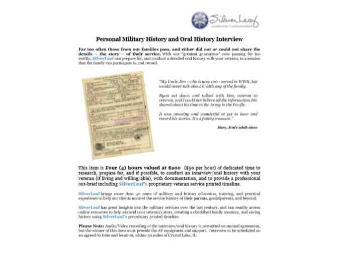 Far too often those from our families pass, and either did not or could not share the details – the story – of their service. With our “greatest generation” now passing far too swiftly, SilverLeaf can prepare for, and conduct a detailed oral history with your veteran, in a session that the family can participate in and record. This item is Four (4) hours valued at $200 ($50 per hour) of dedicated time to research, prepare for, and if possible, to conduct an interview/oral history with your veteran (if living and willing/able), with documentation, and to provide a professional out-brief including SilverLeaf’s proprietary veteran service printed timeline. SilverLeaf brings more than 30 years of military and history education, training, and practical experience to help our clients unravel the service history of their parents, grandparents, and beyond. SilverLeaf has great insights into the military services over the last century, and can readily access online resources to help unravel your veteran’s story, creating a cherished family memory, and saving history using SilverLeaf’s proprietary printed timeline.
