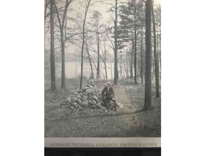14" by 18" black and white poster of landscape photographer, H.W. Gleason, at Thoreau's cairn, Walden Pond, May 19, 1908, made from a glass negative of H.W. Gleason. Mounted on foam core board.
