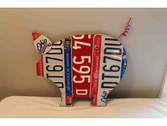 Upcycled Pig, handmade from recycled state license plates.