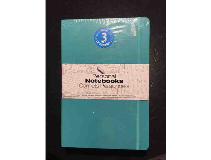 Set of three personal notebooks in turquoise, blue, and lime green. Quality hardcover notebooks with 160 lined pages, elastic band closure and inside pocket.