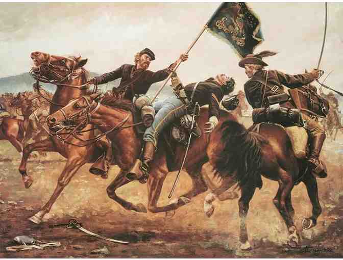 Professionally and tastefully framed print by artist Don Stivers (1926-2009), number 972 of 1000. "A cavalry fight is a swirling melee of swinging arms and pounding hooves; of fragile, twisting bodies and the unstoppable mass of thousands of pounds of horseflesh. It is cold steel, hot lead, and pounding iron and muscle thrown together at a breakneck paceā¦Into the maelstrom rode Pvt. George Crawford Platt, Troop II, 6th US Cavalry on the afternoon of July 2, 1863 at Fairfield, Pennsylvania."