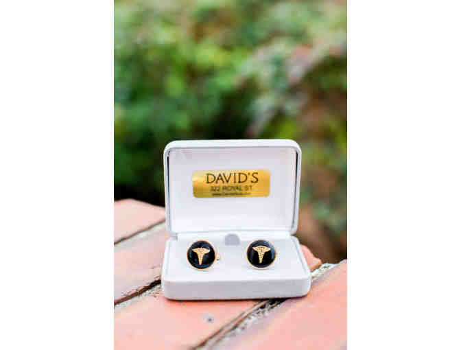 One (1) pair of black and gold cufflinks featuring the caduceus symbol from Dave's Antiques & Jewelry in New Orleans, LA; donated by Dr. Donna Ray (SOM Staff).