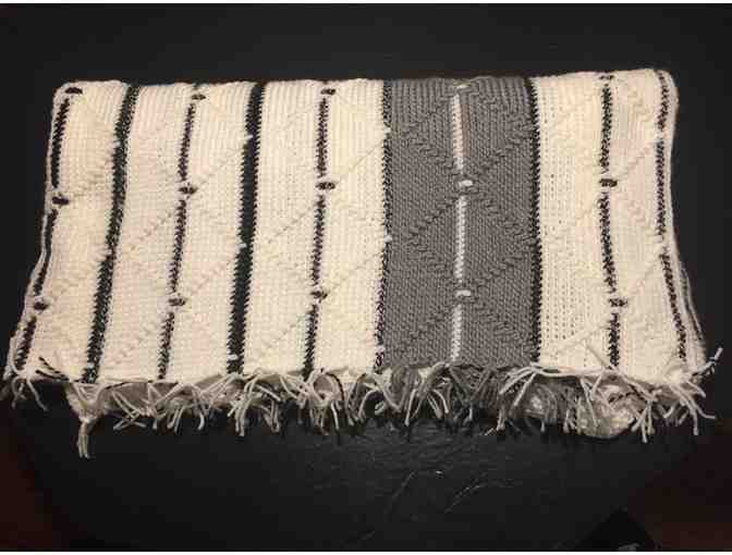 This afghan was hand-knitted by the grandmother of Springbrook's Athletic Trainer, CeCe Sullivan. The color is white, silver with a black accent. It measures approximately 55 inches x 60 inches, and is made from acrylic fiber.