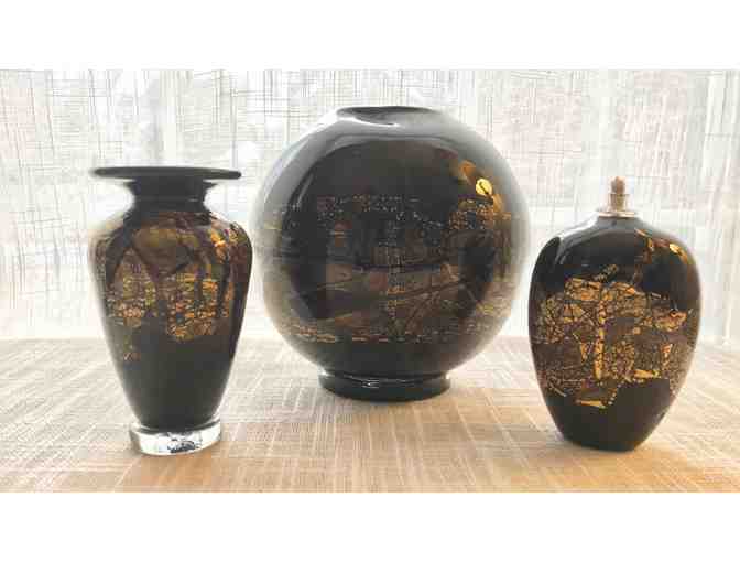 Set includes one small vase (signed at dated by artist), one small oil burner (signed at dated by artist) and one large vase. Beautifully accented with gold.