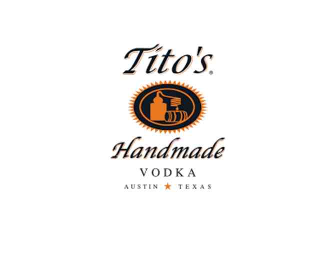 Two 750ml bottles of Tito's Handmade Vodka and Tito's swag.