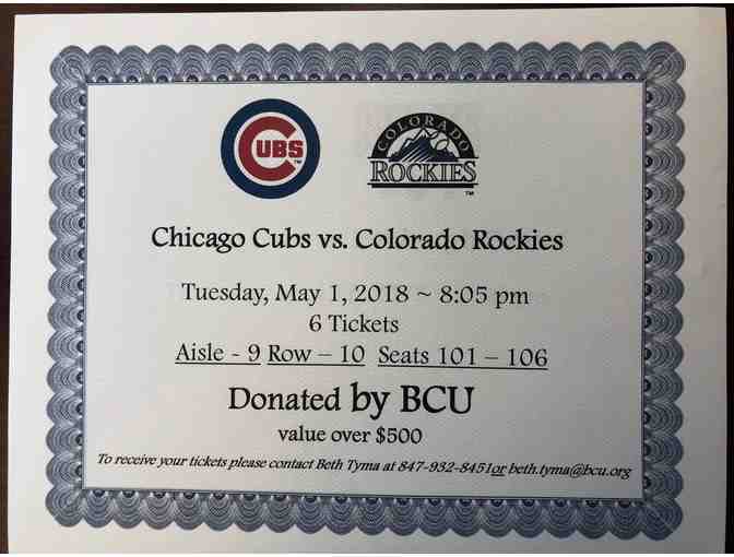 6 Tickets to Cubs vs. Rockies Tuesday May, 1st 7:05 pm. Aisle 9, Row 10, Seats 101-106