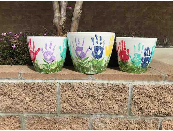 Mrs. Laack's and Mrs. Merziotis' - Helpful Hands Flower Pots. Each of the student's hand prints were put on these becautiful plastic pots in paint for a one of a kind look. Three pots in total.