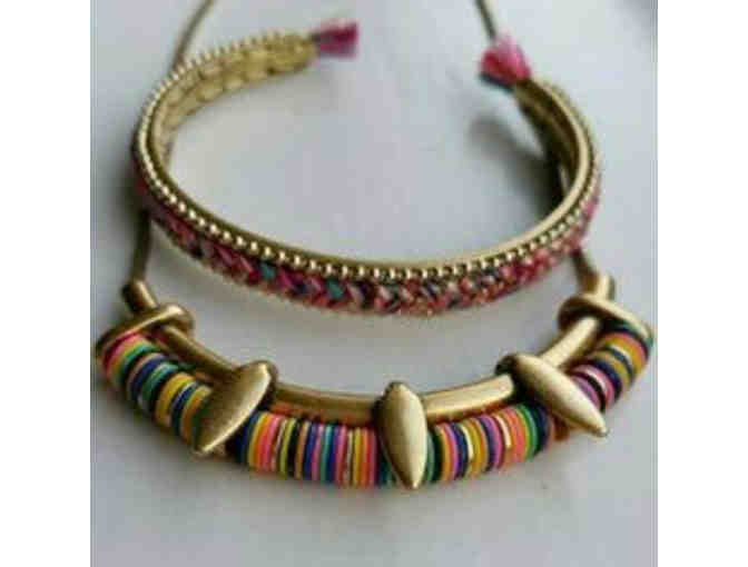 Beautiful tones of pink, blue and gold. The necklace can be worn on both sides for different effects. Set includes: Cuff bracelet and 2 in 1 necklace. Donated by Baywood's Dirksen Family. www.stelladot.com/tammydirksen