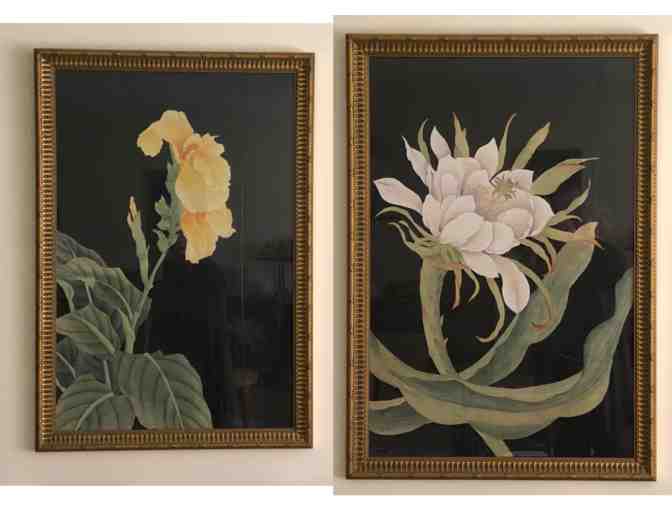 These two remarkable framed prints, exemplify the timelessness and splendor of the art of still life painting. Lush exotic flowers and flower-pot arrangements are fore-grounded animatedly and minutely depicted with serene color palettes and harmonious compositions rendering vibrant modernist works that simultaneously glow with lucid energy and mystical vitality. (Unknown artist/ provenance)