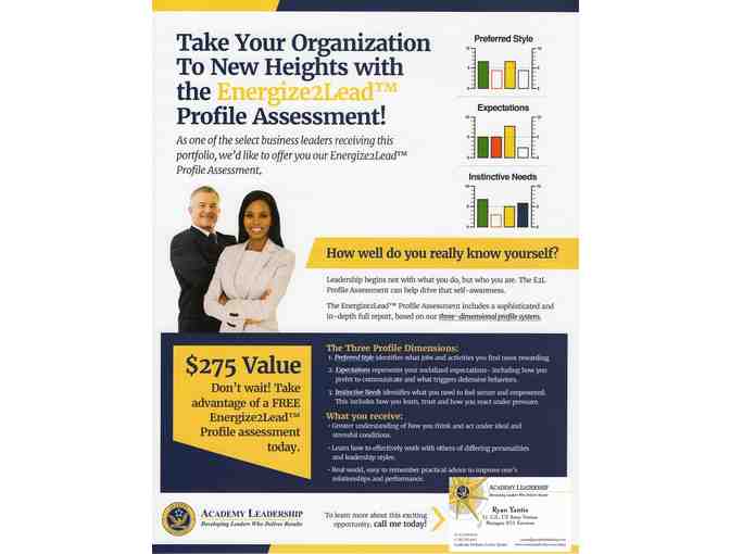 Includes online Energize2Lead Profile™ Assessment, which requires an Internet connected computer, and a follow-up personal coaching session with Ryan Yantis, Lt. Col., US Army, retired, a certified Academy Leadership facilitator. Can be in person within 50 miles of Crystal Lake, or by phone or video-teleconference.