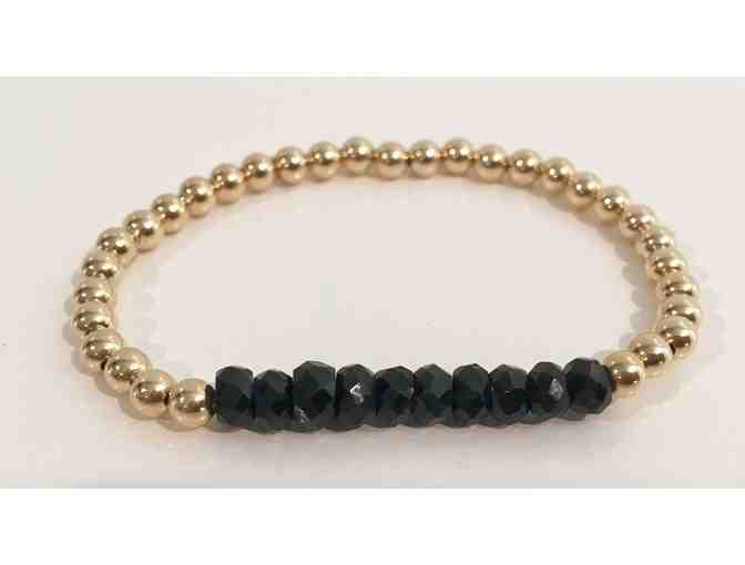 Fun and fashionable 4mm yellow gold filled bracelet with black spinel beads. Stretches to roll onto a size 6 wrist. Stacks well with other bracelets for an endless variety of looks.