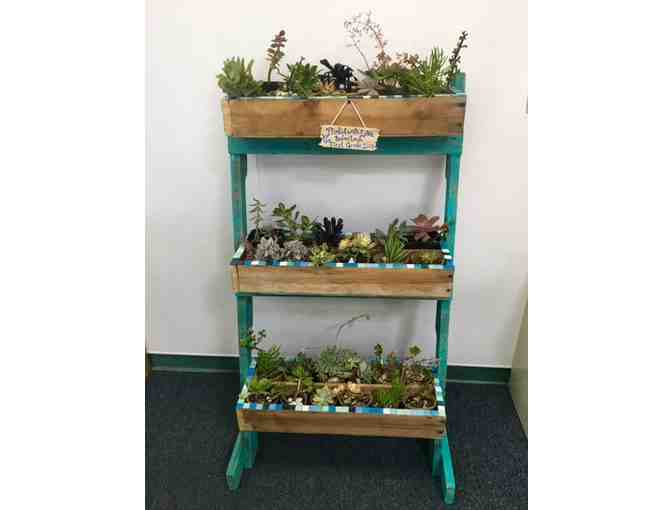 Free standing 3-tier succulent planter made from all Recycled Wood. Custom designed, hand painted and decorated with mosaic glass tiles by First Grade class (DLI Bulow/Lorch.) Features more than 30 hand planted succulents with sea shell accents.
